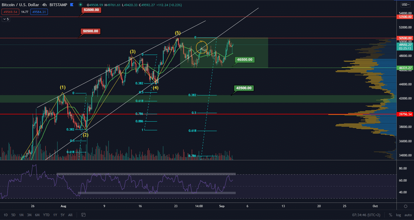 Bitcoin od dosiahnutia maxima 50 500 $ z dňa 23. augusta stále stagnuje v sideway štruktúre medzi hladinami 46 500 $ a 50 500 $. Cena vytvorila na supporte dvojité dno a na rezistencii dvojitý vrchol. Býčí target ostáva na hladine 53 500 $, avšak cena potrebuje prelomiť spomínanú rezistenciu a to najlepšie aj s podporou objemov.