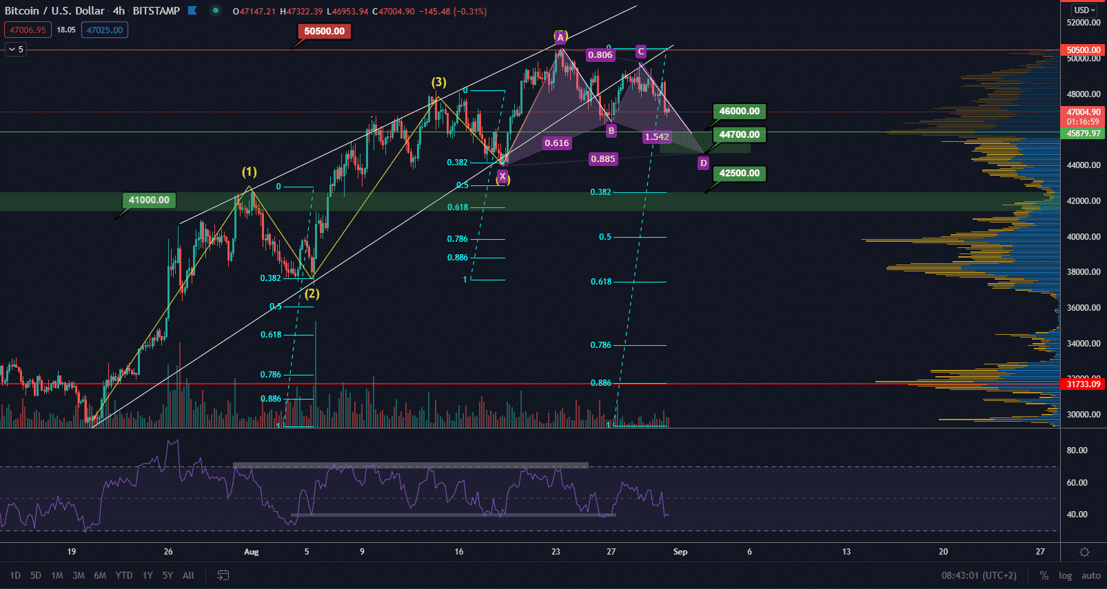 Bitcoin vytvára posledný klesajúci leg CD v rámci potenciálneho harmonického patternu, ktorý vzniká po uzavretí rastúceho dlhodobého klínu. Rastúci klín predstavoval nárast ceny hlavnej kryptomeny z 29 000 $ na 50 500 $. Práve hladina 50 500 $ je rezistentnou hladinou a práve na tomto bode bol ukončený piaty leg tohto klínu.