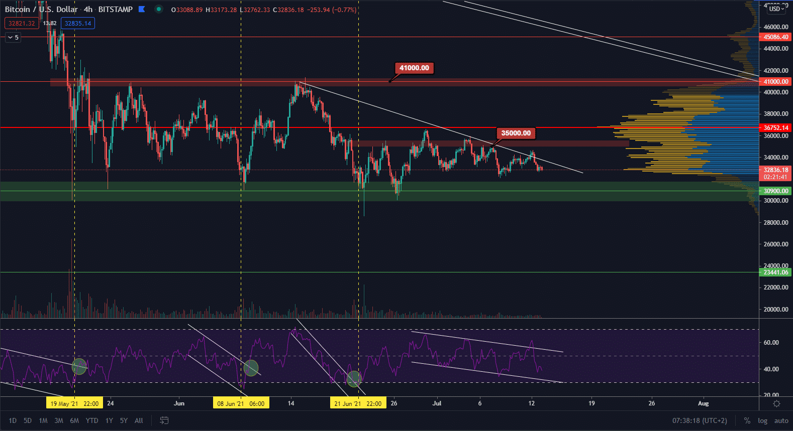 Po uzatvorení triangla budeme sledovať hlavnú supportnú oblasť okolo hladiny 31 000$. Ak nebude udržaná, tak ďalšou oblasťou je hladina okolo 27 000$. V takomto prípade by však pokles ukončil sideway štruktúru a nastal by korekčný leg. Z dlhodobého hľadiska však Bitcoin ešte má priestor na prepad, nie však nižšie ako predošlé ATH na 20 000$.