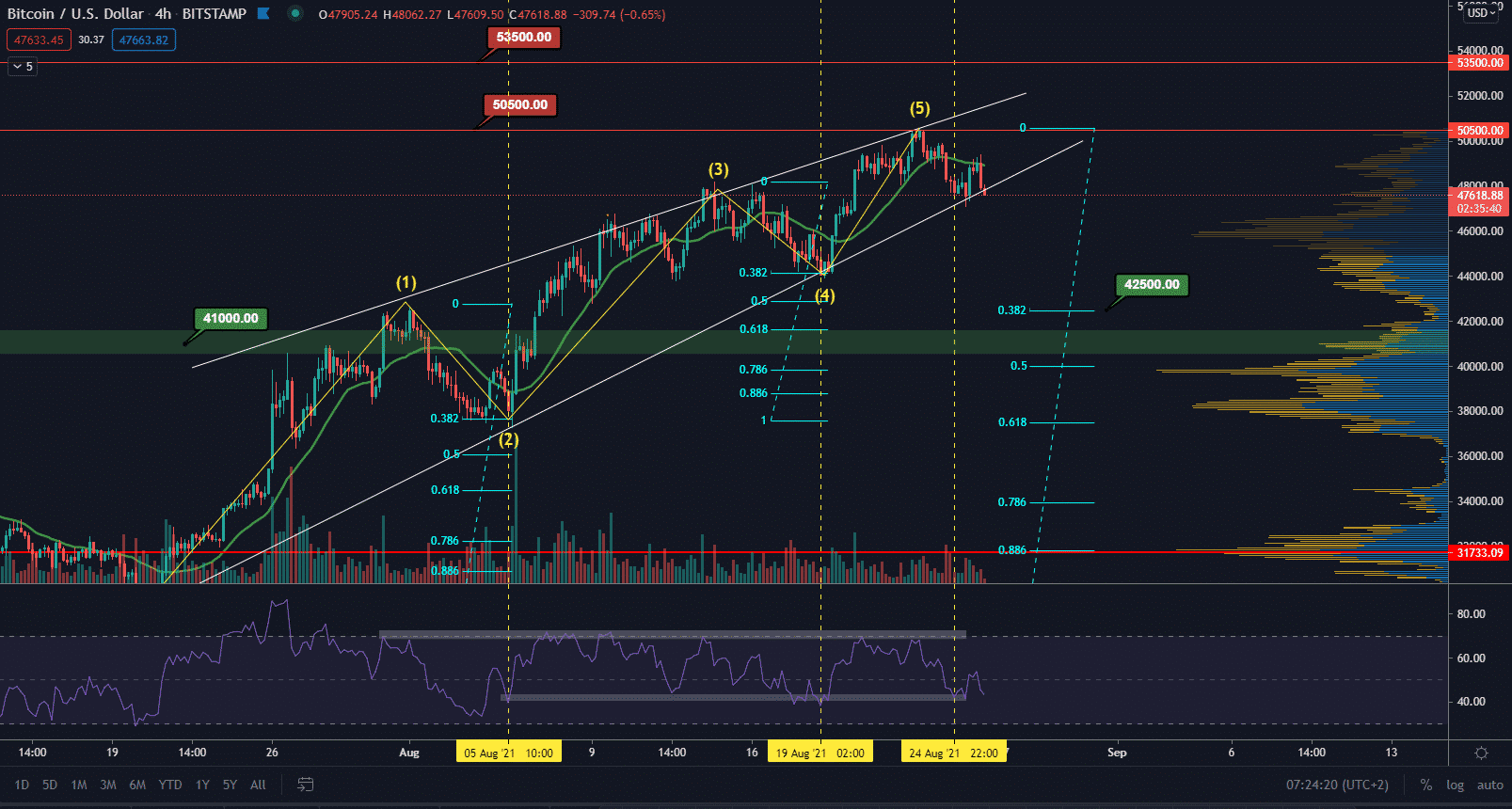 Okrem toho rastúci klín by mal predstavovať 5 Elliotiek, ktoré taktiež už vznikli, pričom bod 5 rešpektoval rezistenciu na 50 500 $. Nehovoriac o tom, že objemy klesajú a negatívne divergujú s cenovým pohybom. Rovnako je na tom aj RSI, ktoré taktiež počas celého rastu vytvára negatívnu divergenciu. Hlavný support pre udržanie rastu na RSI je zóna 40 až 43 bodov.