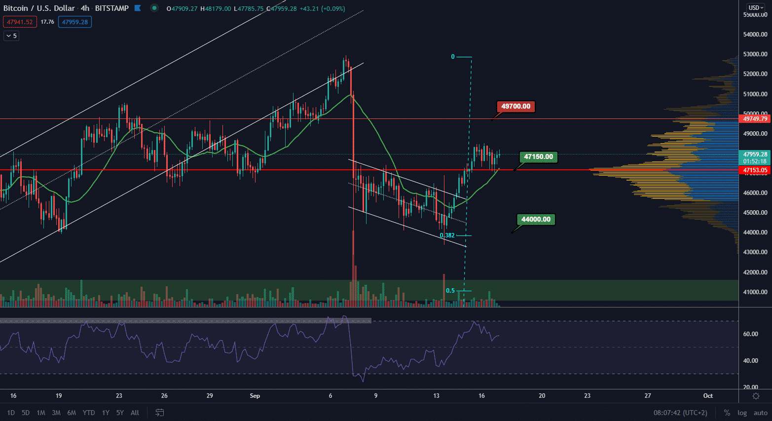 BTC sa odrazil od supportnej hladiny na point of control 47 150 $ a pokračuje v rastúcom trende. Objemy však tento rast zatiaľ nepodporujú a je možné, že tento rastúci trend narazí čoskoro na svoj vrchol. Kde sa nachádza ďalší býčí target v prípade, že cena porastie? Poďme sa pozrieť na krátkodobú predikciu pohybu ceny hlavnej kryptomeny.