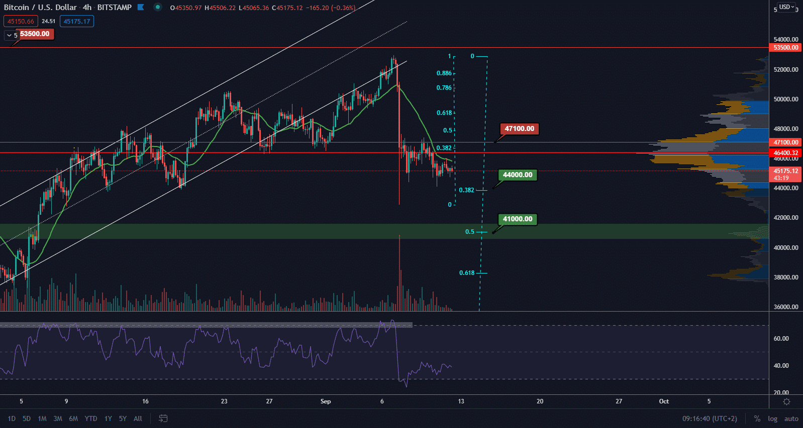 Bitcoin síce vytvára klesajúce maximá, avšak cena zatiaľ nevytvorila klesajúce minimá. Krátkodobo sme teda sideway v rámci korekcie. Ak prekonáme MA21, najbližší target je na hladine hornej hranice sideway štruktúry 47 100 $. Ak cena zo sideway štruktúry vyletí smerom nadol, prvý target je na hladine 44 000 $. Tento target vyplýva z 38,2 % retracementu celého predošlého rastúceho trendu z 29 000 $ na 53 000 $.