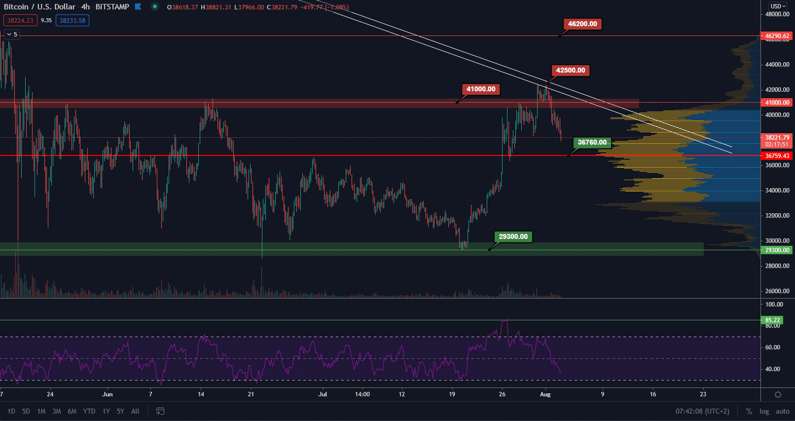 Bitcoin zatiaľ neindikuje ukončenie klesajúceho legu. Prvým targetom, od ktorého môže nastať odrazenie, je hladina na point of control celej sideway štruktúry na hodnote 36 760 $. Ani táto hodnota však nemusí znamenať koniec korekcie. Dôležité bude po akomkoľvek odraze dosiahnuť vyššie lokálne minimá. Ďalší dlhodobý support sa nachádza na hladine 33 000 $.