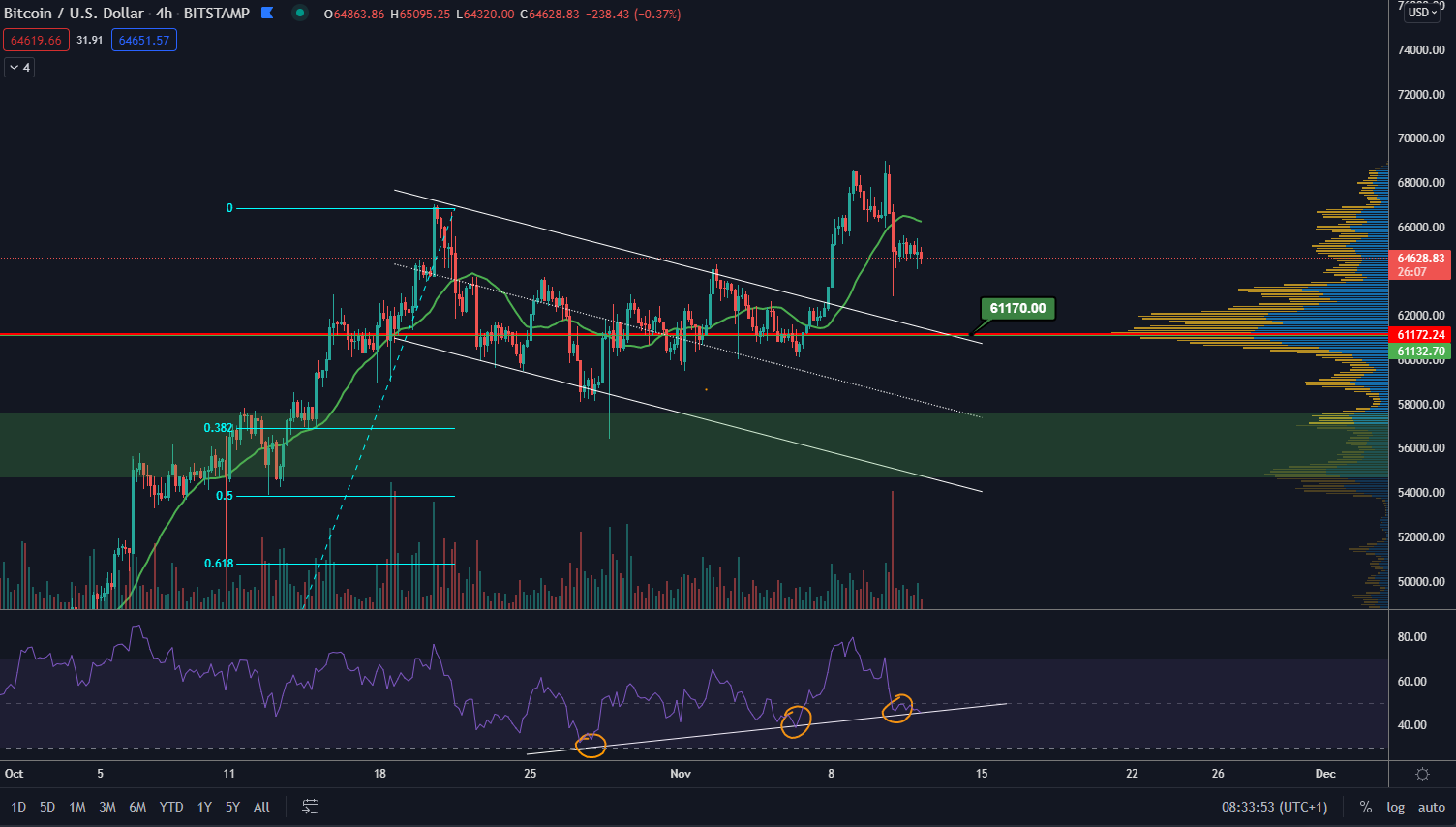 Po neudržaní MA21 na perióde 4H sa cena posunula ešte nižšie. Najbližší support, ktorý budeme sledovať, je na hladine point of control cca 61 170 $. Cena by sa tak vrátila naspäť do sideway štruktúry, od ktorej by sa odrazila a pokračovala v raste. Na druhej strane je možné aj to, že cena by sa smerom nahor odrazila okamžite.