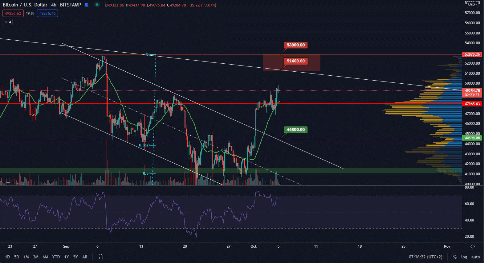 Ide o dlhodobú rezistenciu z lokálnych maxím, ktoré sú od ATH klesajúce. Ak by sa totižto cene podarilo prekonať rezistenciu 53 000 $, tak by to znamenalo prvé dlhodobé rastúce maximum od ATH. Inak povedané, nový bullrun by bol potvrdený. Či sa to však cene podarí už pri prvom pokuse je otázne. Na to by sme potrebovali vysoké objemy a tiež menšiu prekúpenosť.