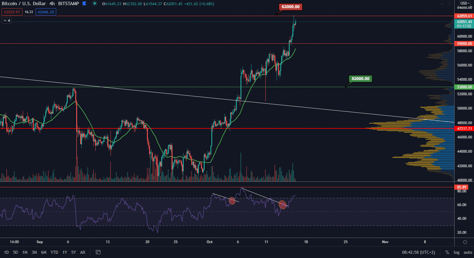 BTC aj posledných 24 hodín pokračoval v rastúcom trende a dosiahol maximum 62 940 $. Cena tak vstupuje do poslednej zóny rezistencie. Buď teda pôjdeme na nové ATH okamžite, alebo sa cena na istý čas pri ATH zastaví a bude stagnovať pred prierazom. Trh sa však z krátkodobého hľadiska začína prehrievať a preto prerazenie ATH nemusí byť okamžité.