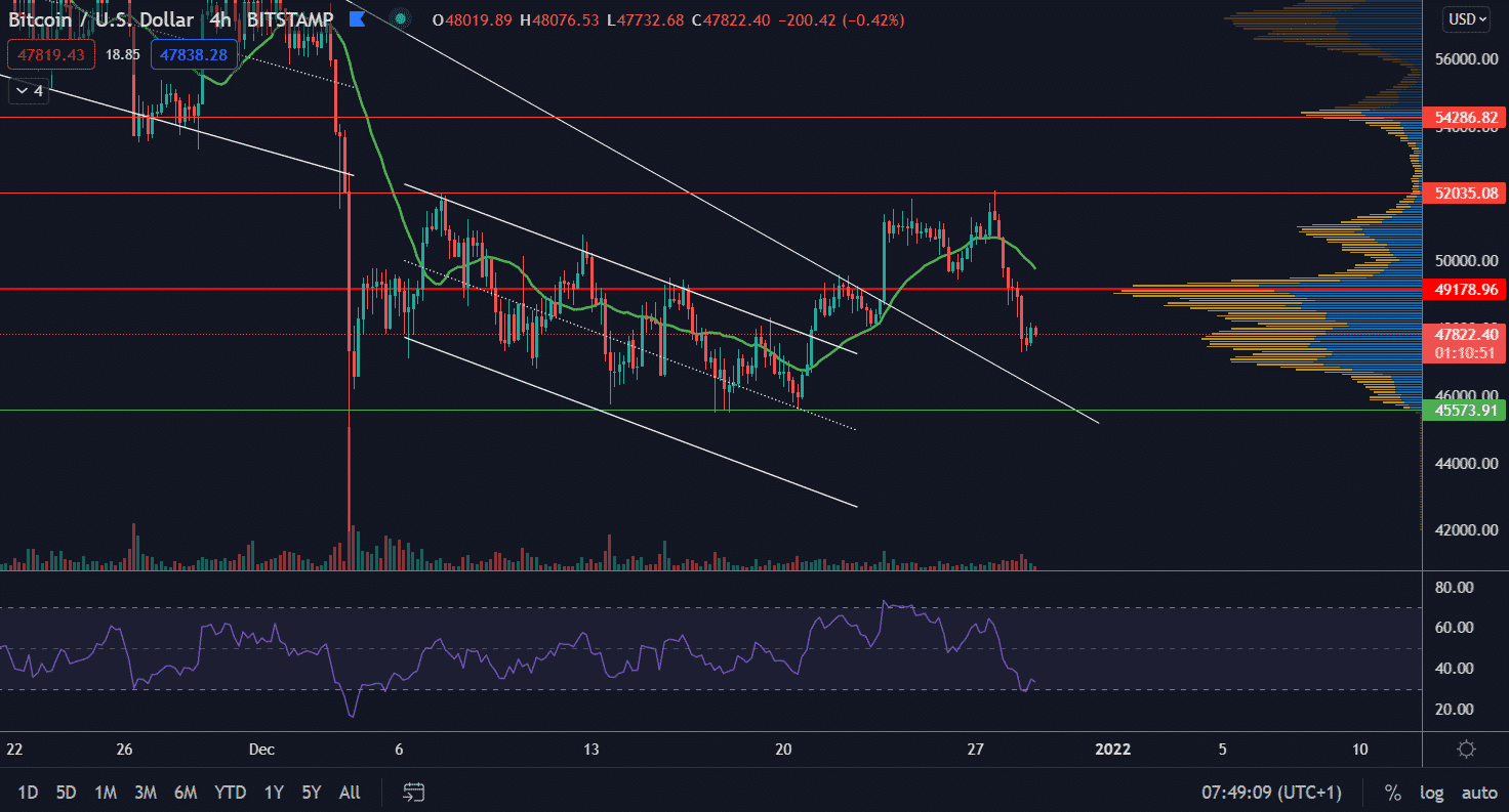 Bitcoin má najbližší support na cca 46 500 $, kde sa nachádza predošlá rezistencia z lokálnych maxím korekcie a môže byť spätne otestovaná ako support. Ďalšia supportná hladina sa nachádza priamo na hodnote 45 600 $, kde sa nachádza support celej sideway štruktúry a práve táto hladina musí byť udržaná.