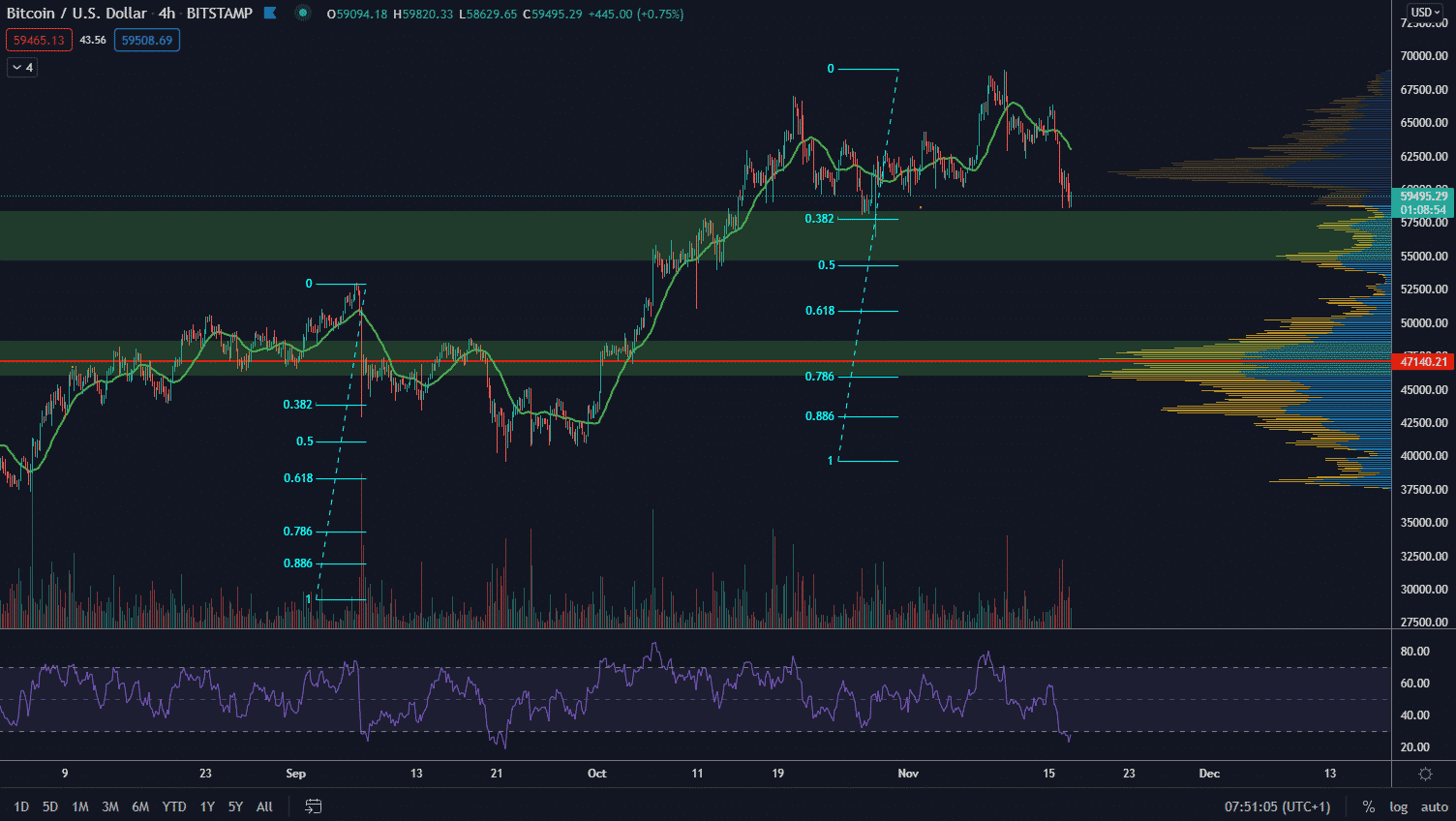 BTC sa nachádza v klasickej korekcii, ktorá dosiahla 15-percentný pokles od ATH. Spadol tak do prvého targetu oblasti 38,2 % retracementu z predošlého rastu. Len pre porovnanie, posledná korekcia zaznamenala prepad 25 %. Zatiaľ tak nejde o žiadnu silnú korekciu a dlhodobý trend Bitcoinu nebol narušený. Napriek tomu sa poďme pozrieť na to, kde by cena mohla ešte spadnúť.