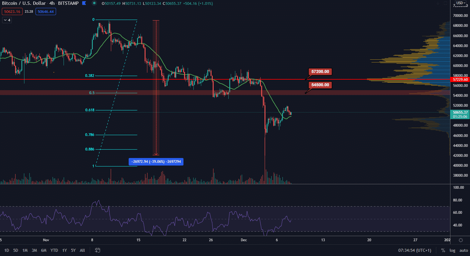 Posledné minimum by sa mohlo sformovať na MA21, čo by vytvorilo pre cenu krátkodobý support. Zatiaľ však minimum na tomto bode nie je potvrdené. Najbližšie rezistencie sa nachádzajú na hladinách 54 500 $ a 57 200 $. Po vytvorení maxima celého legu nás bude predovšetkým zaujímať pozícia ďalšieho minima.