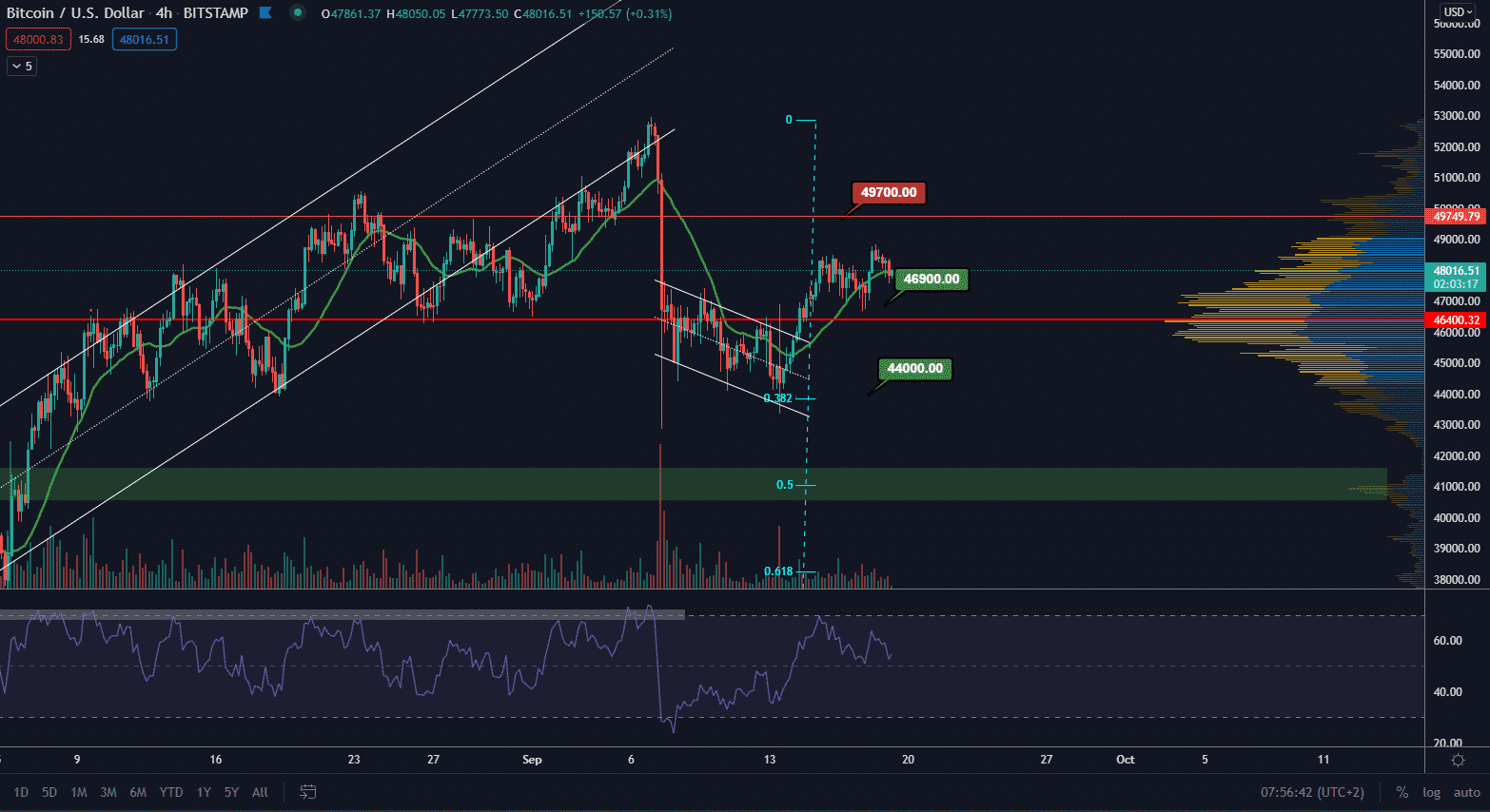 BTC sa nachádza stále v rastúcom trende, no posledné maximum vzniklo blízko toho predošlého. Stále je tak pravdepodobnejší scenár, že na prerazenie maxima 53 000 $ si ešte budeme musieť počkať. Z krátkodobého hľadiska rastúci trend stráca na sile a je možné, že cena pôjde sideway a následne do korekcie.