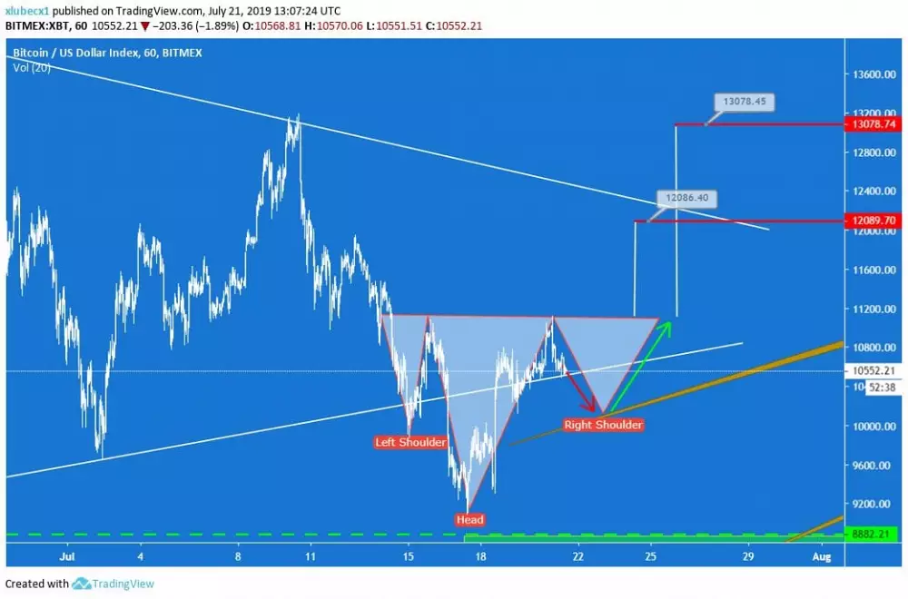 Na 4H grafe sa vytvoril pattern H&S. Môžeme sledovať dokončenie pravého ramena, ktoré by malo byť dokončené na hodnote okolo 10 200 USD. Práve na tejto hodnote by mal nastať odraz a cena by sa mala vrátiť späť na 11 200 USD. Ak by cena išla na 11 200, Pattern H&S bude dokončený, aby bol ale platný, cena musí ísť na 13 000 USD. Na grafe môžete vidieť, kde budem sledovať úrovne na výstup z obchodu.
