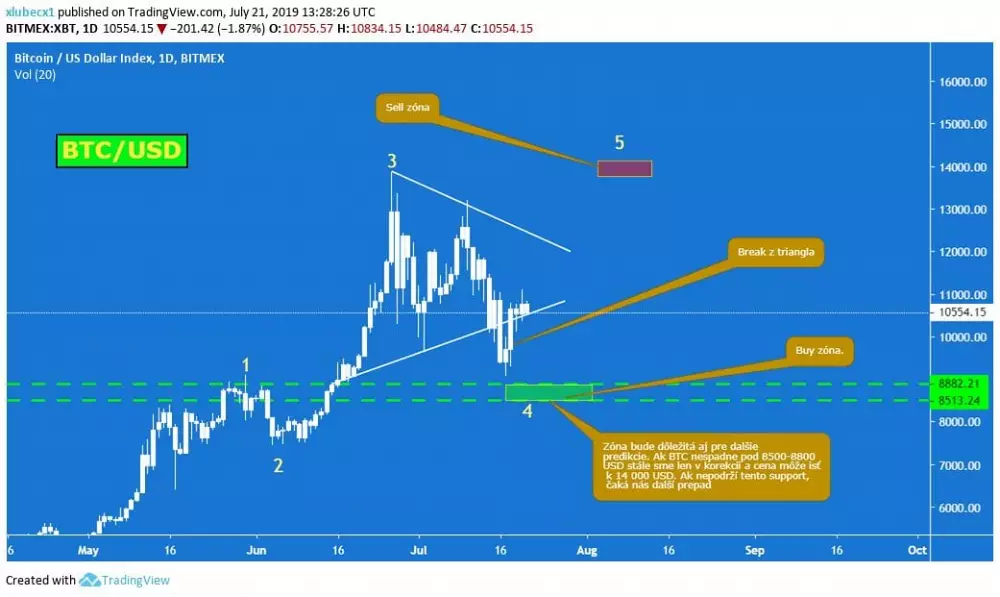 Bitcoin sa momentálne nachádza v korekčnej štruktúre. Sledujem, že cena po fake pohybu z triangla sa vrátila späť na 11 000 USD. Čakám v najbližších hodinách, že príde skôr pohyb hore na 12 000 USD. Keď si zanalyzujem BTC z pohľadu rastúceho trendu, ktorý začal ešte koncom minulého roka, sledujem, že sme aktuálne v korekčnej 4. vlne, v ktorej sa často nachádza triangel. V najbližších týždňoch čakám ešte jeden pohyb k 14 000 USD a vytvorenie patternu dvojitý vrchol.