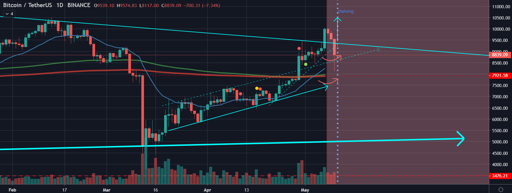 Pri pohybe dolu sa už od 22.4. držíme trendovej rezistencie druhého stupňa (viď graf), ktorá sa teraz nachádza okolo ceny 9 000 USD. Ďalej tu máme prerušený horný okraj vzostupného kanála okolo 8 600 USD a spodný okraj sa nachádza okolo 7 400 USD.