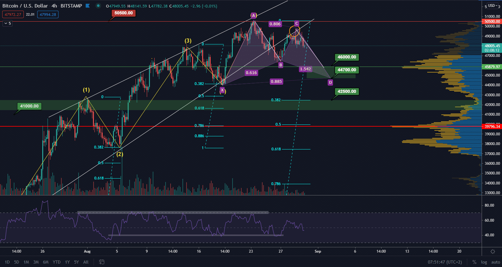Bitcoin uzatvoril rastúci klin, otestoval v bode C novú rezistenciu a teraz sa vytvára potenciálny harmonický pattern. Ak sa teda cena nachádza v klesajúcom legu, malo by ísť o posledný leg v rámci tohto patternu. Supportná zóna sa nachádza v intervale od 44 700 $ do 46 000 $.