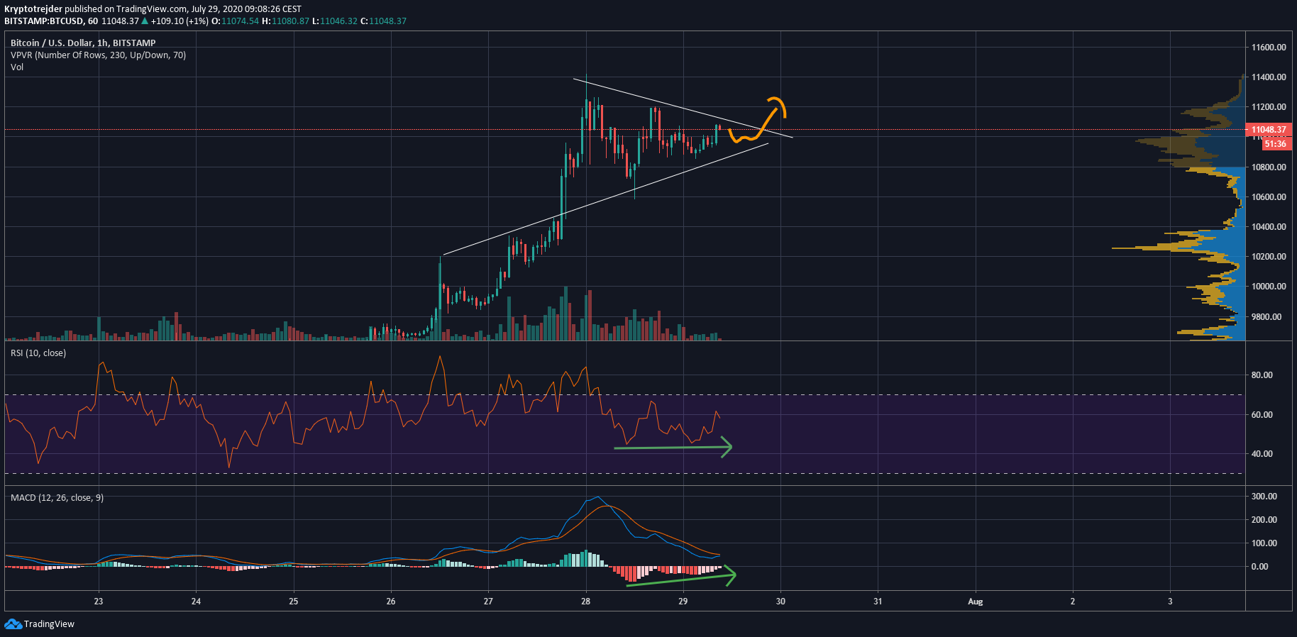Cena BTC konečne prerazila dlhodobý trojitý vrchol na 10 500 $. Maximum vystrelilo až na 11 420 $. Započali sme tak dlhodobý rastúci primárny trend. Krátkodobo vidíme konsolidáciu v trojuholníku, po ktorom očakávam pokračovanie uptrendu, čo potvrdzujú aj objemy. Nasledujúci graf poukazuje na vývoj ceny BTC.