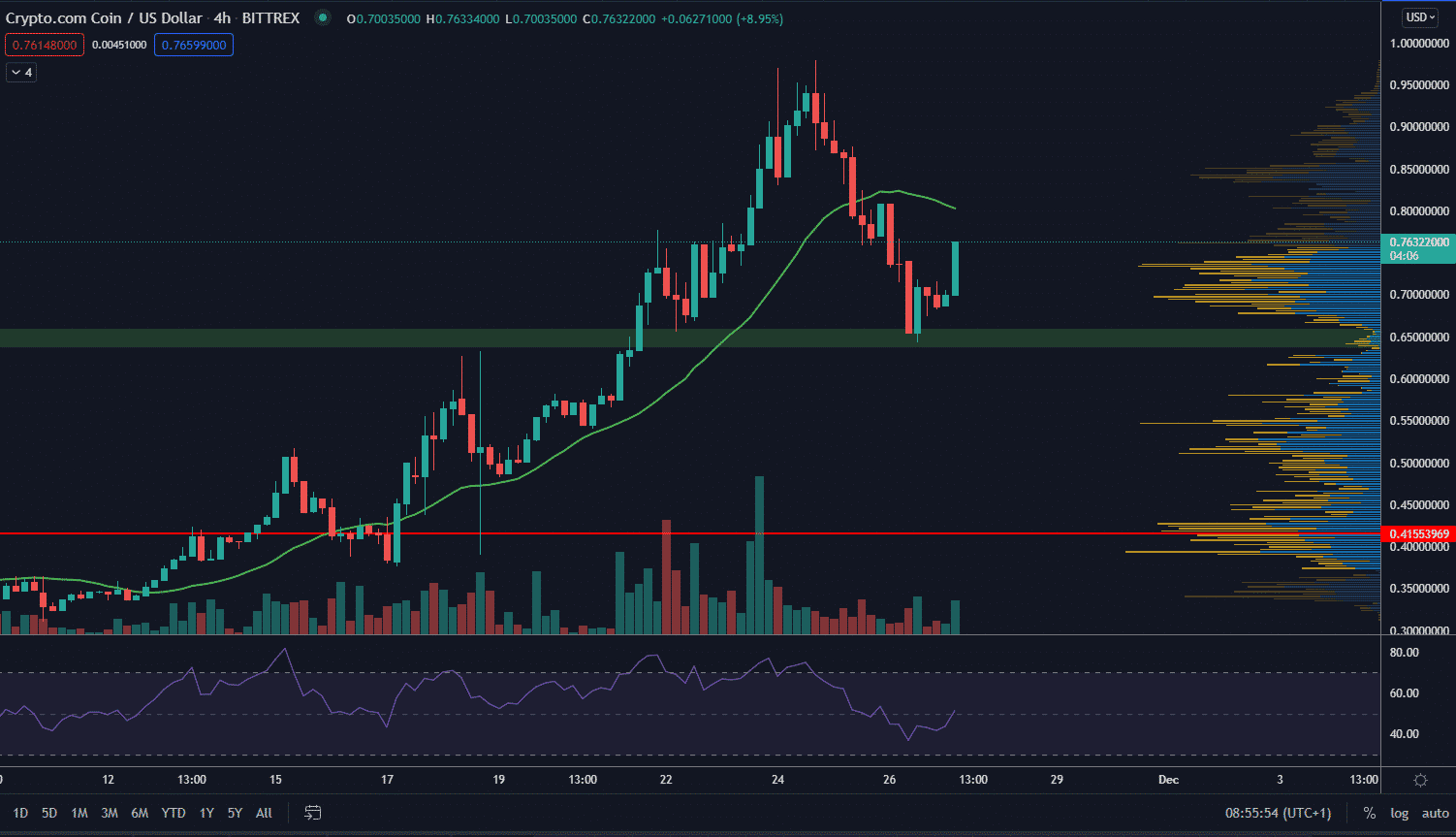 Crypto.com bude čoskoro čeliť rezistencii na indikátore MA21. Ten sa v súčasnosti nachádza na hladine 0,797 $. Je potrebné očakávať blížiace sa lokálne maximum. Cena určite nepôjde na nové ATH okamžite. Navyše, cena nevytvorila ďalšie lokále minimum a teda nevieme, či budú rastúce. Preto je na mieste počkať si na vytvorenie ďalšieho minima.