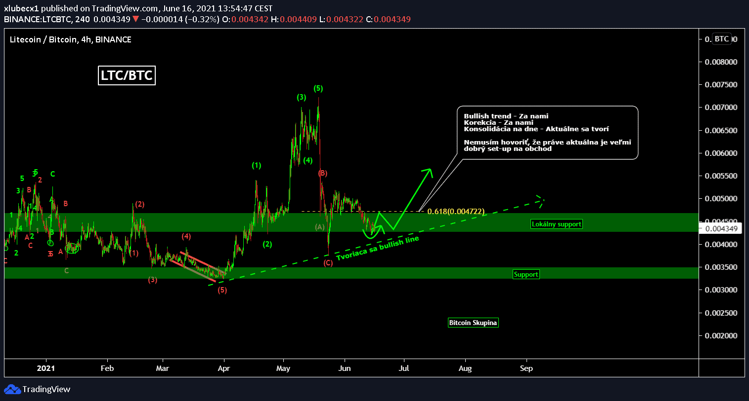 Litecoin už má po korekcii a teraz konsoliduje na lokálnom dne. Aktuálny set-up je úplne ukážkový na vstup. Volatila na trhu začína upadať a postupne sa trh začína spamätávať z minulo mesačného poklesu. Dokonca aj support na 0,0042 BTC zatiaľ podržal. Ja osobne mám už nejaký ten deň otvorený obchod na LTC a očakávam cenový nárast.