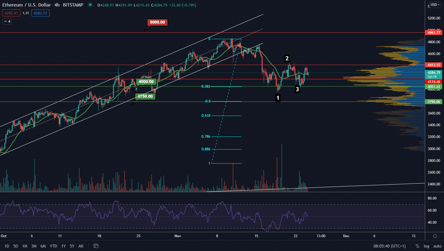 Supporty sa nachádzajú najbližšie na hladine 4 000 $ a 3 750 $. Reverzia trendu nastane, keď cena prekoná 4 400 $ na dennom grafe close cenou. Následne by jedinú rezistenciu mal predstavovať interval cca od 4 600 $ do 4 700 $. Ak by však pokračoval medvedí sentiment na trhu krátkodobo, tak je možné aj to, že cena neudrží posledné minimum.