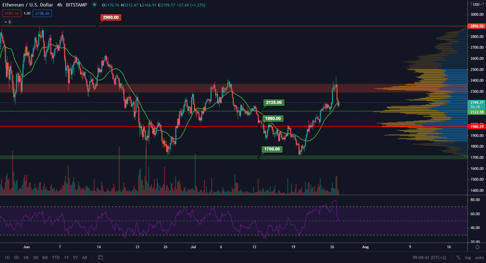 Ethereum rešpektovalo rezistentnú zónu na hladine cca 2 350 $. Momentálne sa nachádza v klesajúcom legu a trhová cena je na hladine MA21. Ak udržíme tento indikátor, cena môže pokračovať v náraste. Na druhej strane budeme sledovať najbližšie supportné zóny na hladinách 2 125 $ a point of control na hladine 1 980 $. Z dlhodobého hľadiska sme stále sideway medzi 2 350 $ a 1 700 $.