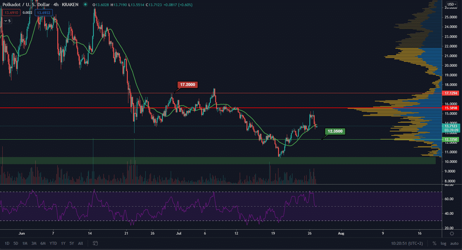 Polkadot sa odrazil od rezistencie na hladine blízko point of control 15,58 $. Cena pokračuje dlhodobo sideway a z krátkodobého hľadiska sa nachádza na MA21. Supportná zóna, ku ktorej sa v prípade prerazenia môže cena dostať, je na hladine 12,35$. Naopak bullish target je stanovený na hladine POC 15,60 $ a 17,20 $.
