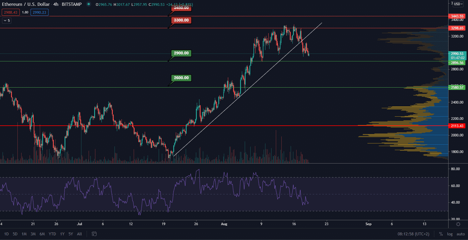 Na druhej strane však odraz môže nastať aj okamžite pomocou V-shape recovery. Z dlhodobého hľadiska potrebuje Ethereum vytvoriť vyššie lokálne minimum, čo pravdepodobne aj nastane. Cena sa totižto prvýkrát nachádza v miernej korekcii od počiatku rastu z 21. júla. Rezistencie ostávajú na hladinách 3 300 $ a 3 450 $.