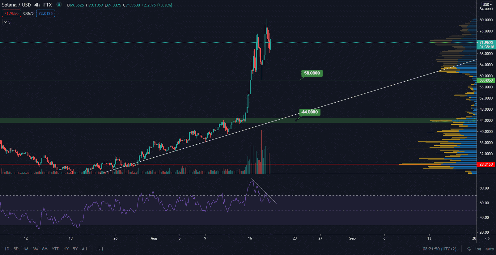 Napriek tomu, že objemy sú radikálne zvýšené a ide o býčí signál, tak musíme brať do úvahy aj to, že trend slabne. To, že slabne, neznamená, že už nenastane ďalší rastúci leg. Skôr to znamená, že je namieste vyberať značnú časť svojich ziskov, následne počkať na korekciu a znovu kupovať. Rezistencia na tomto grafe momentálne neexistuje a Solana objavuje nové nepreskúmané cenové hladiny.