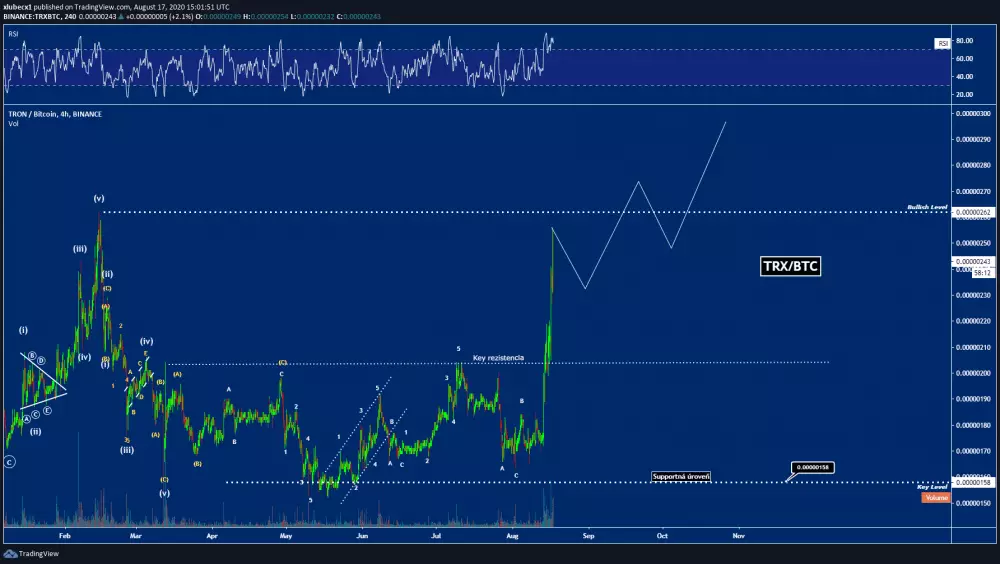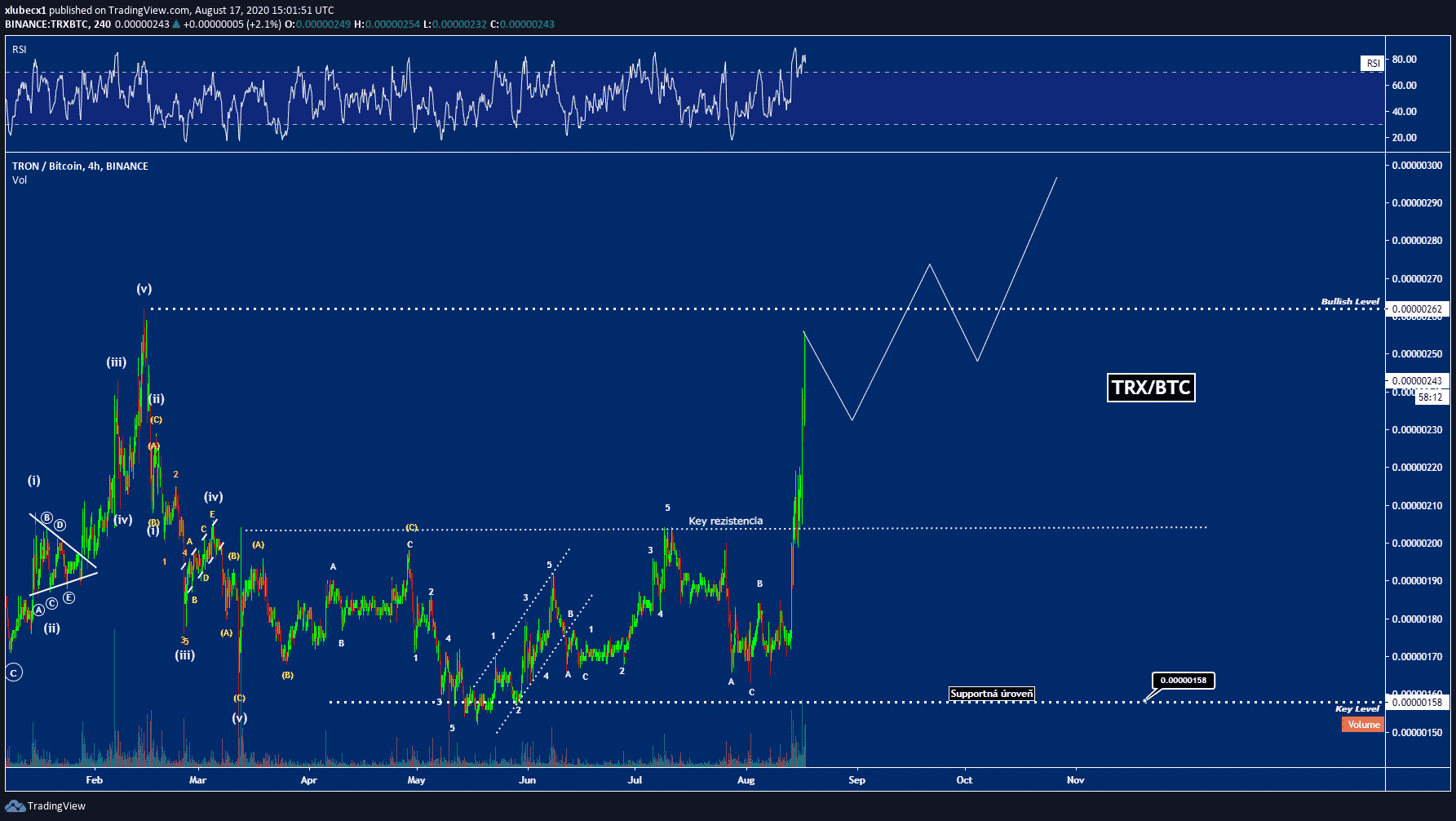 TRX sa nám konečne dal do pohybu. Ukážková sideways štruktúra na dne je konečne dokončená a s veľkou pravdepodobnosťou sa včerajším bullish pohybom začal nový, dlhodobý bullish trend. Korekcia samozrejme môže prísť, ale kto je už v obchode, tak sa mi zdá zbytočné vystupovať.