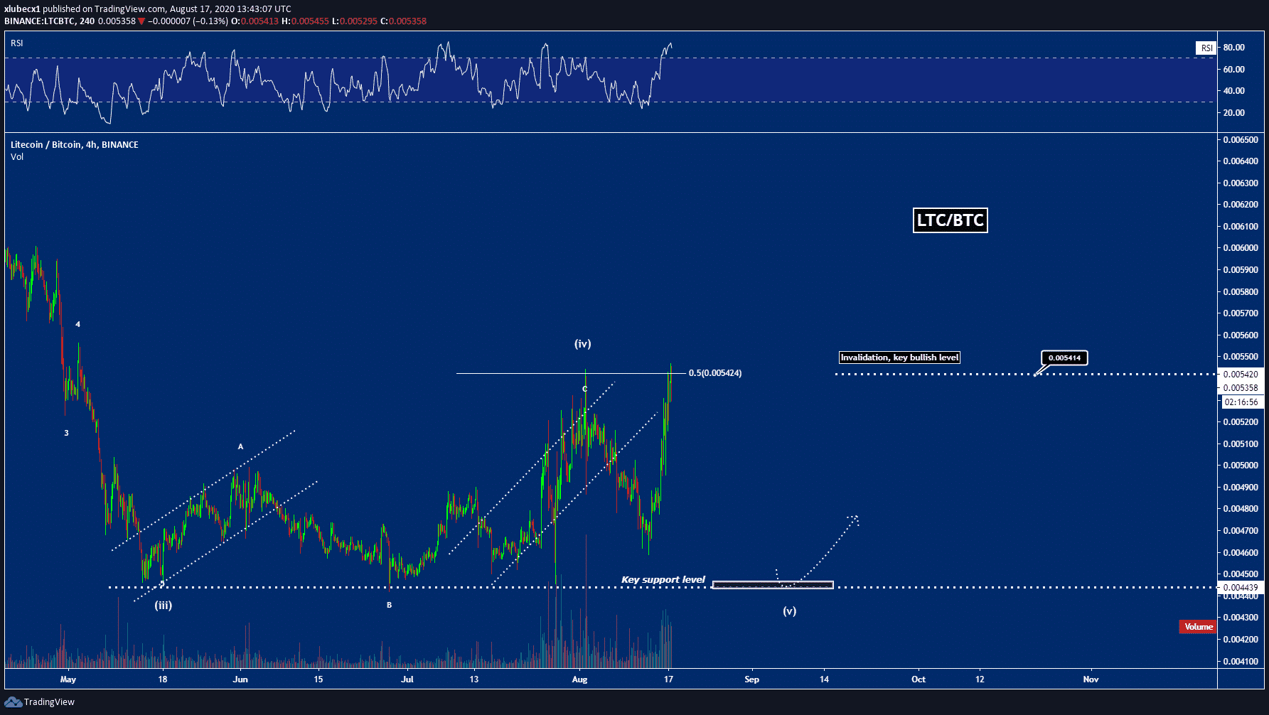 LTC sa v súčasnosti pohybuje na veľmi dôležitej kľúčovej úrovni. Hladina 0,0054 BTC je 0,5 Fib. ratracement 3. vlny, kde by sme v prípade bullish marketu (a následného poklesu) dávali stoploss. V tomto prípade ide ale o invalidation hladinu bearish cyklu. Pokiaľ by prišiel break out, tak je pomerne vysoká pravdepodobnosť, že LTC už má to najhoršie za sebou a začne konečne rásť!