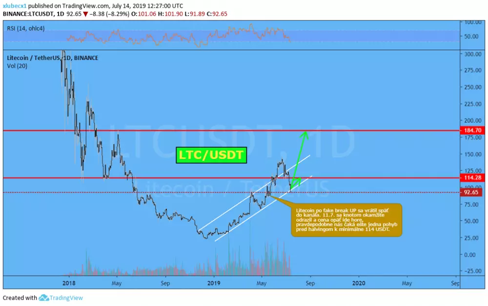 Litecoin podobne ako voči BTC aj s párom voči USDT je LTC bullish. Minulý týždeň sa opäť odrazil od spodnej trendovej čiary kanála a cena znovu rastie. Pred halvingom očakávam posledný pohyb minimálne k 114 USD. Ak by prešiel znovu break z kanála a silné Fomo spôsobené práve halvingom, cena môže prísť až k silnej rezistencii na 184 USDT.