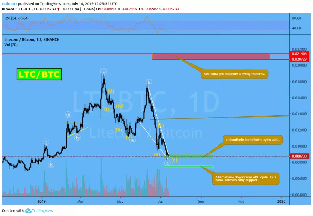 Litecoin od svojej minimálnej hodnoty na začiatku roka až po maximum, ktoré mal v apríli spravil 100 % zisk. Od apríla je ale v pomernej dlhej korekcii, kde sa vrátil späť na svoje hodnoty zo začiatku roka. Po 5. vlnách hore sa aktuálne nachádza Litecoin v ABC korekcii. Nákupná zóna je na úrovni okolo 0,0085 – 0,009 BTC. Ako alternatívnu buy zónu, kde je silný support, sledujem na hodnote 0,007 BTC.