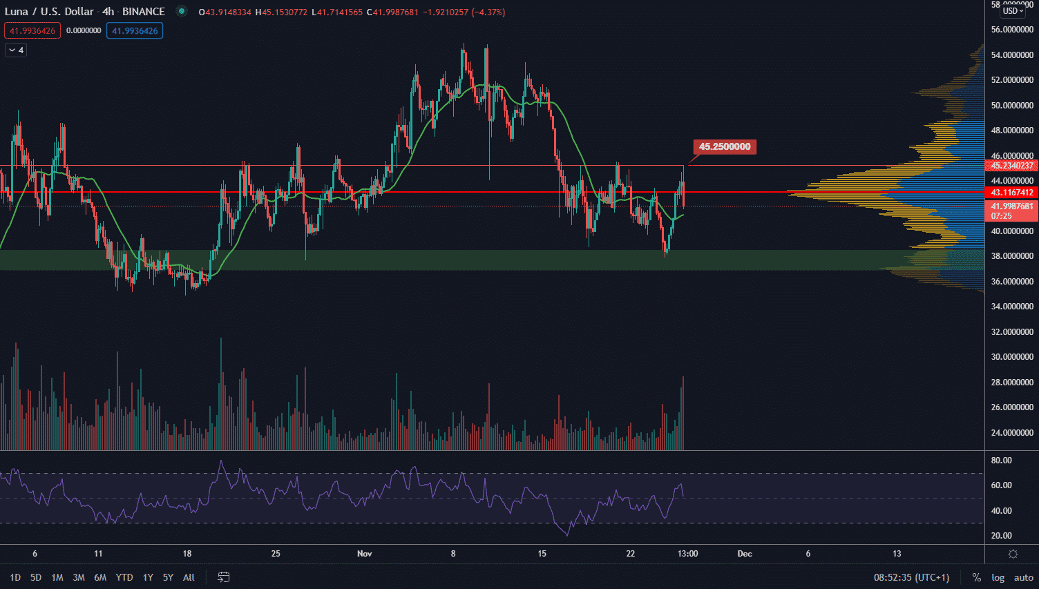 LUNA pokračuje podobne ako väčšina altcoinov v sideway štruktúre z krátkodobého hľadiska a momentálne klesá. Vytvoril sa trojitý vrchol na hladine 45,25 $, čo zároveň predstavuje rezistenciu sideway štruktúry. Na druhej strane máme support okolo posledného minima na hladine 38,00 $.