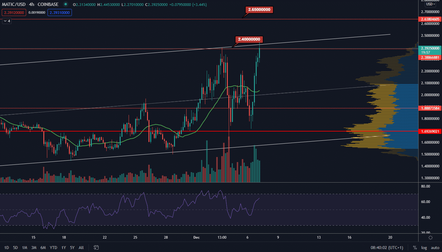 Už tento týždeň sa rozhodne, či MATIC definitívne ukončí tento flag. Preraz by mal byť sprevádzaný objemami, čo je zatiaľ splnené. RSI indikovalo pozitívnu divergenciu pri dvojitom dne, no podstatnejšie je, že v súčasnosti nie je vo fáze prekúpenosti a aj z krátkodobého hľadiska je teda priestor na rast ceny.