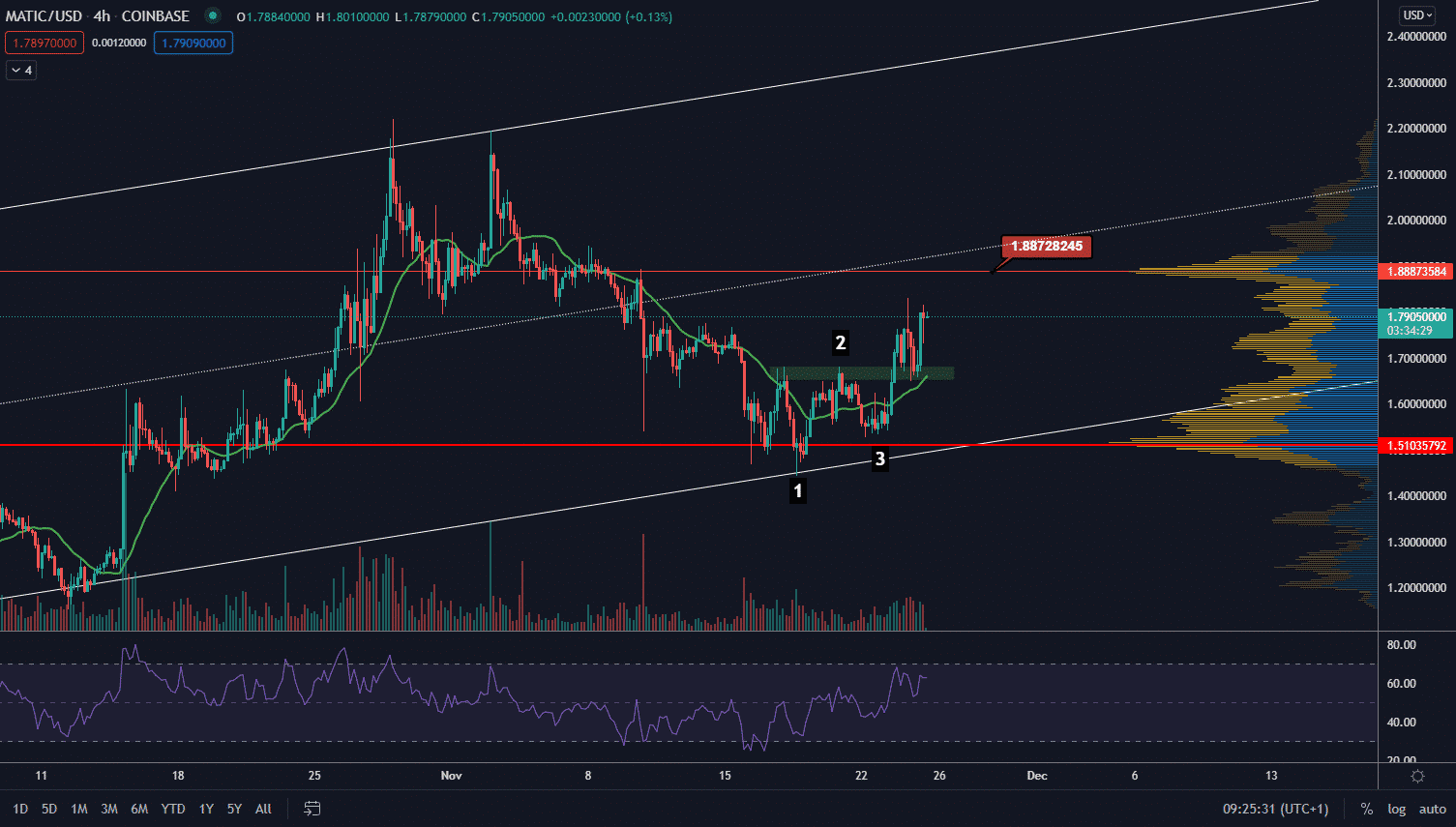 MATIC sa dokázal odraziť od posledného lokálneho minima, ktoré otestovalo predošlé maximum a tým potvrdilo 123 bottom formation. Na rozdiel od Bitcoinu, ktorý stále svoj reverzný pattern nepotvrdil, cena MATIC-u sa šplhá v rastúcom trende smerom nahor. Zdá sa dokonca, že rastúci trend neutícha a pokračuje. Kde sa nachádza ďalší target?