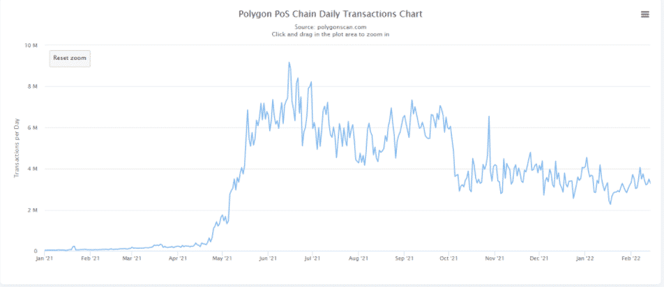 Po obrovskom náraste používania v máji má vedľajší reťazec Polygon (MATIC) v priemere viac ako dvojnásobok denného objemu transakcií Etherea. Polygon sa v súčasnosti teší približne 3 miliónom transakcií denne.