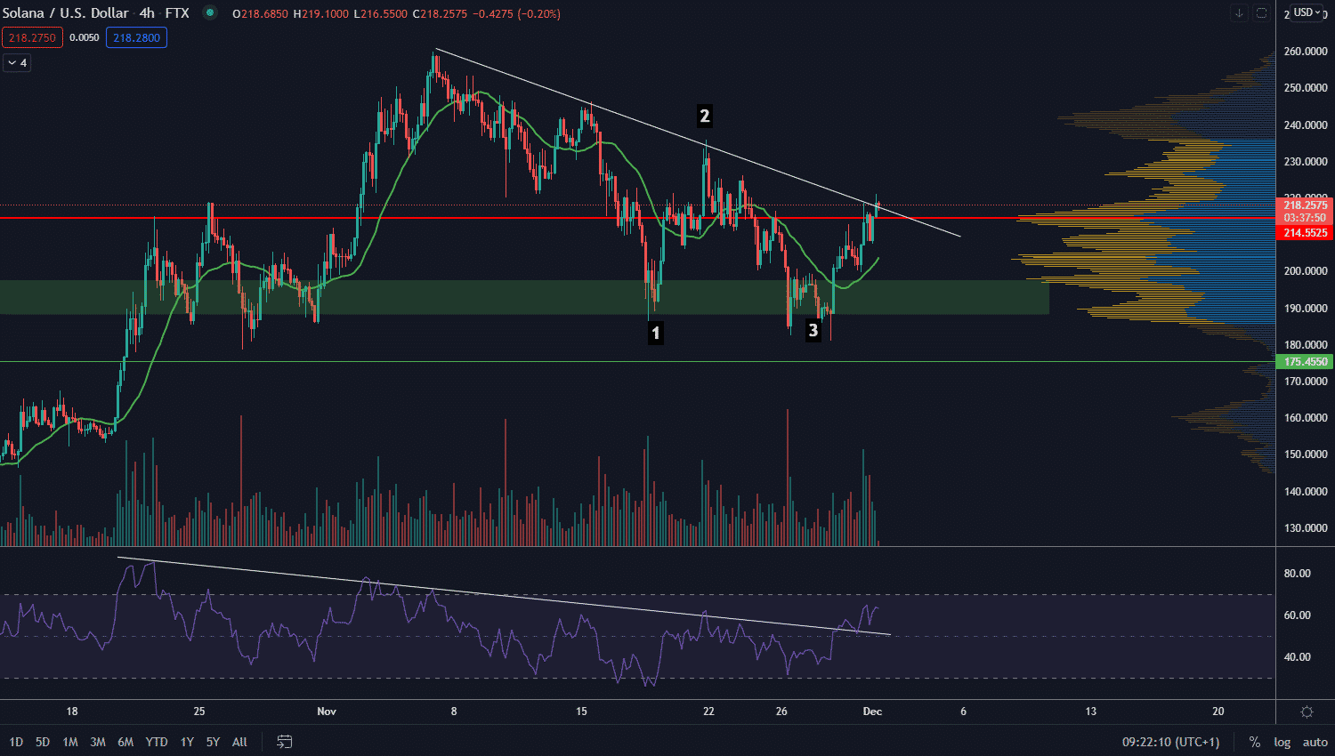 Keď cena prekoná bod 2, potvrdí sa reverzný pattern 123 bottom formation. Tento pattern je pomerne dlhý a predstavoval by počiatok nového rastúceho trendu Solany. Čo sa týka medvedieho scenára, tak SOL nesmie spadnúť pod bod 3, kde sa, mimochodom, nachádza silná supportná zóna.