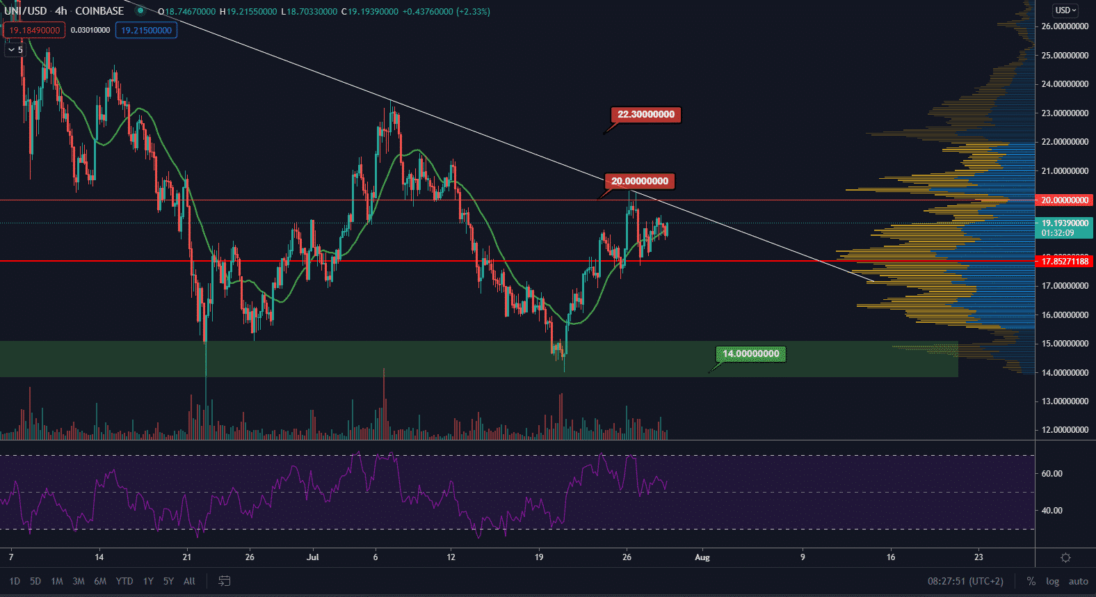 Uniswap rešpektoval rezistenciu z lokálnych maxím a stále sa nachádza v descending triangli, ktorý trvá už od posledného májového týždňa. Po zamietnutí však cena znovu rastie. Tento rast sa však spomaľuje. Indikátorom zmeny trendu bude prekonanie hladiny 20,00 $. Následne budeme targetovať hladinu point of control 22,30$. Zatiaľ je však cena stále v triangli a môžeme byť aj svedkami korekčného legu, v prípade, že cena zlyhá pri kontakte s hodnotou 20,00 $.