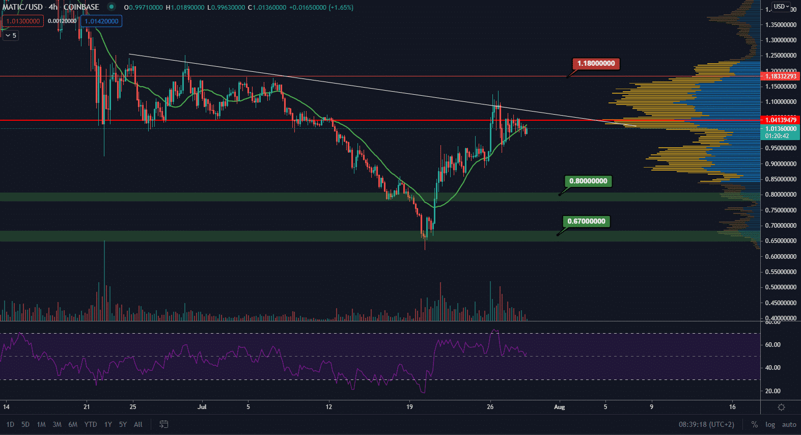 MATIC taktiež narazil na rezistenciu a momentálne sa obchoduje už mierne pod MA21. Objemy sú nízko a s tohto hľadiska je možné, že krátkodobo pôjdeme smerom nadol. Okrem toho sa trhová cena nachádza na zóne point of control. Ak by sme išli nad túto zónu, tak by sme sledovali bullish target na hladine 1,18$. Naopak hlavný support sa nachádza na hladine 0,80$. Dlhodobo sa korekčný leg stále neporušil.