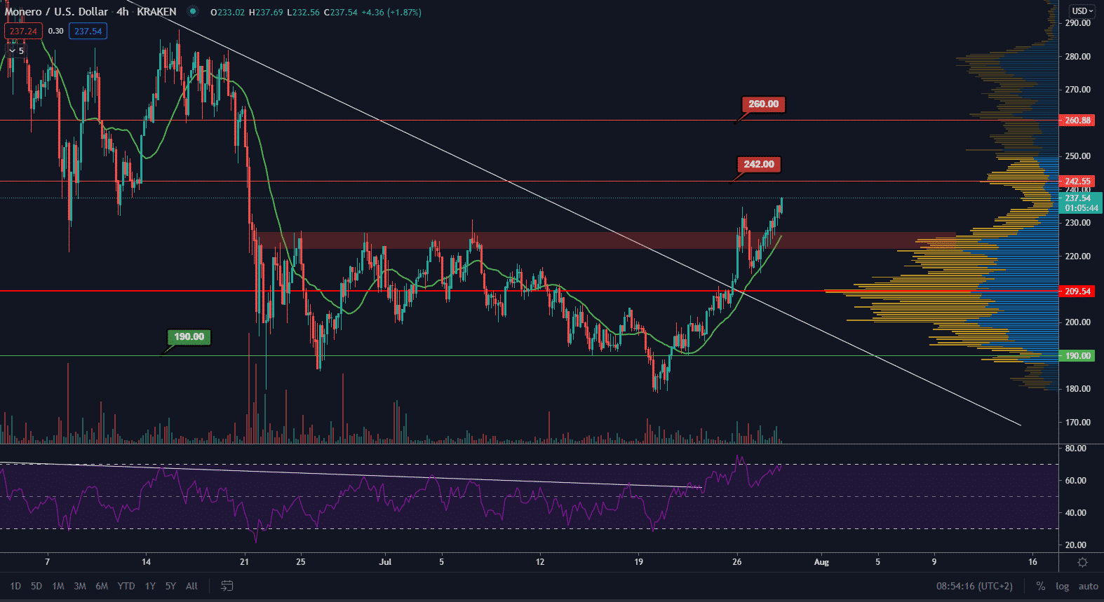 Monero už naopak dokázalo rezistenciu prekonať a trhová cena smeruje na nové lokálne maximum. Bullish targety, ktoré sledujeme sú na hladine 242 $ a 260 $. Objemy sú zatiaľ stabilné a cena stále rešpektuje MA21 na perióde 4H. Tento indikátor považujeme za support a cene sa podarilo už 4-krát ho otestovať.