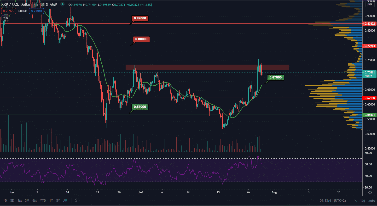 Ripple je stále dlhodobo sideway aj keď krátkodobo sme zo štruktúry vyleteli. Bullish targety sa nachádzajú na hladinách 0,80 $ a 0,87 $. Najbližší support je na hladine MA21 na cca 0,67 $. Aj v tomto prípade už MA21 bola 3-krát otestovaná lokálnymi minimami. Bullish indikátorom je aj rastúci objem.