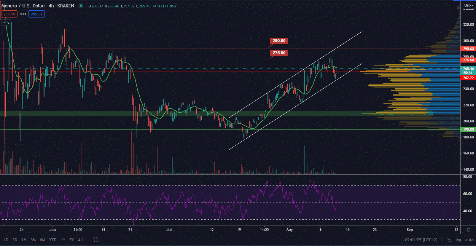 Monero pokračuje v rastúcom flagu, ktorý by sa mal nakoniec uzavrieť medvedím legom. Zatiaľ však rast pokračuje a cena bude čeliť rezistencii na hladine dvojitého vrcholu 275 $. Ak cena na tejto hodnote zlyhá, tak minimálne pôjde do sideway štruktúry. V prípade, že naopak cena túto rezistenciu prekoná, tak smerujeme na ďalší target 290 $.