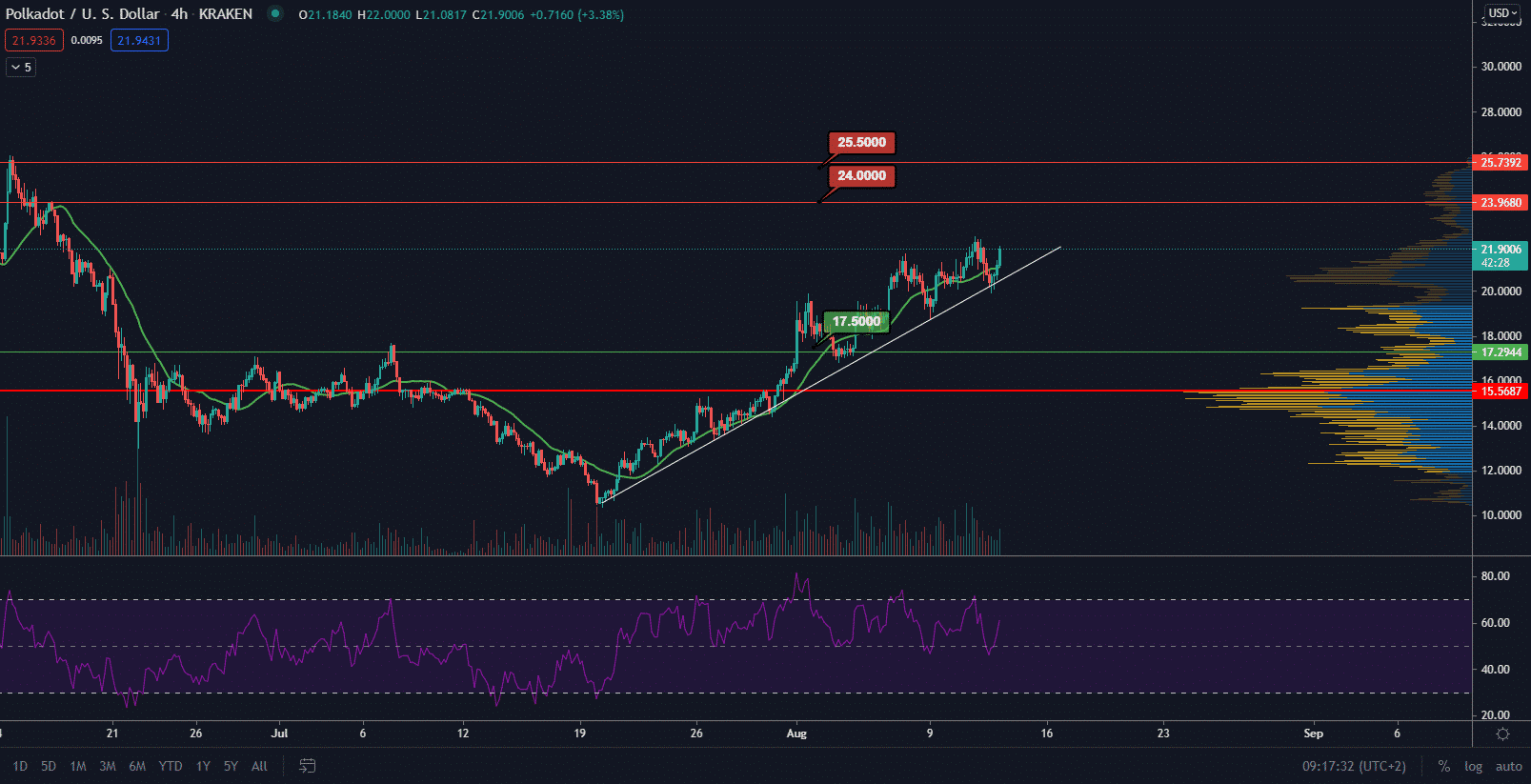 Polkadot pokračuje podobne ako Monero v rastúcom legu a posledným minimom otestoval support tohto legu. Aj tu teda očakávam pokračovanie rastúceho trendu s targetmi na hladinách 24,00 $ a 25 50 $. Býčím ukazovateľom je aj fakt, že objemy počas rastúceho legu sú značne vyššie ako počas predošlého klesajúceho legu.
