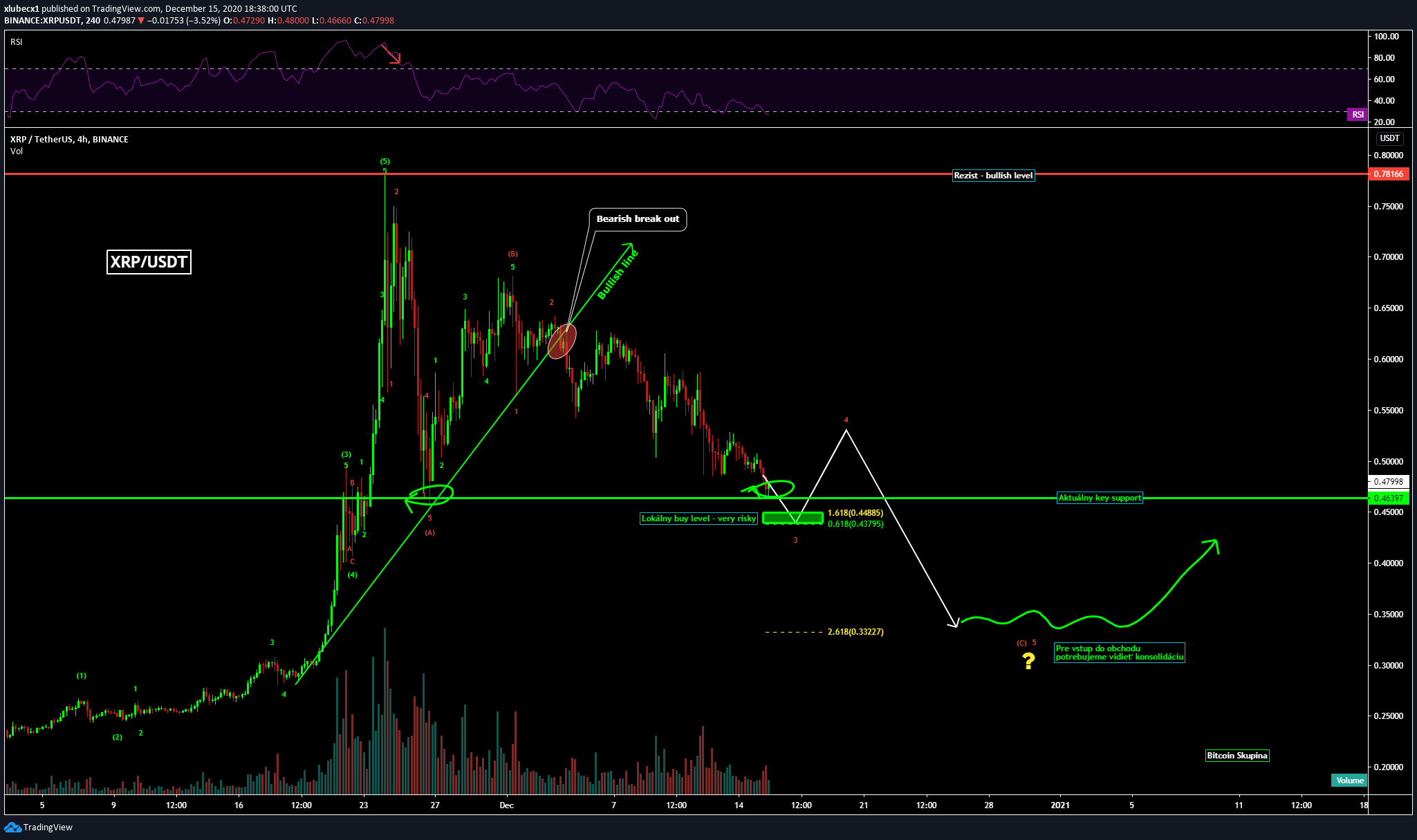 V prvom rade treba brať graf z pohľadu tradera. Nehráme sa na to, že kde sa chytí dno, alebo kam až spadne. Musíme graf vnímať ako nástroj na hľadanie obchodných príležitostí. A tie na XRP nie sú žiadne. Pre vstup do obchodu si v prvom rade potrebujeme počkať na konsolidáciu a až následne otvárať obchod. Aktuálne sa s veľkou pravdepodobnosťou tento altcoin nachádza iba v 3. vlne, takže času ešte bude dosť!