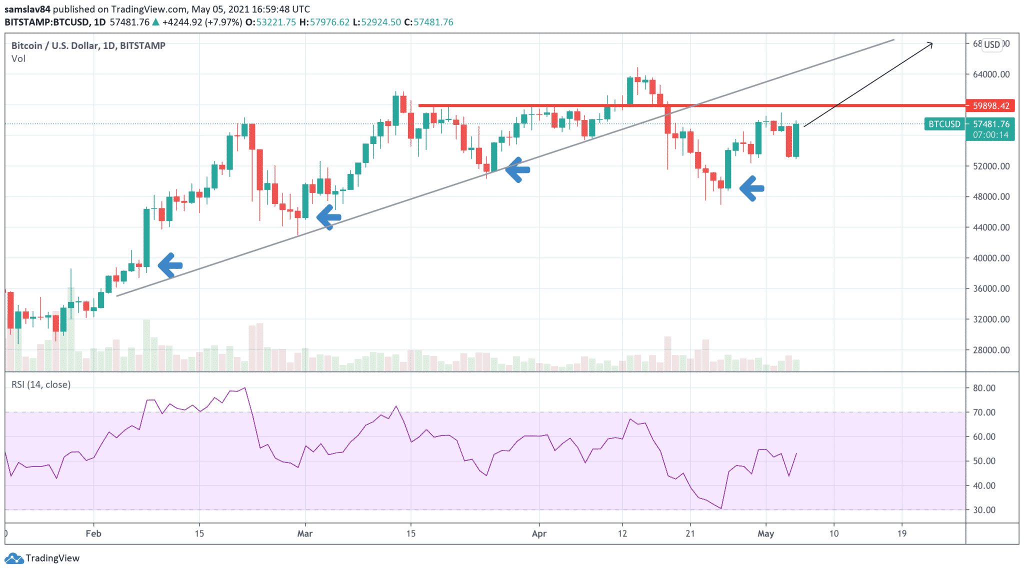 V posledných dvanástich hodinách však zaznamenal celkom zaujímavý skok. Zo spodnej hranice konsolidačného pásma vystrelil k tej hornej a aktuálne sa obchoduje za 57 500 dolárov.