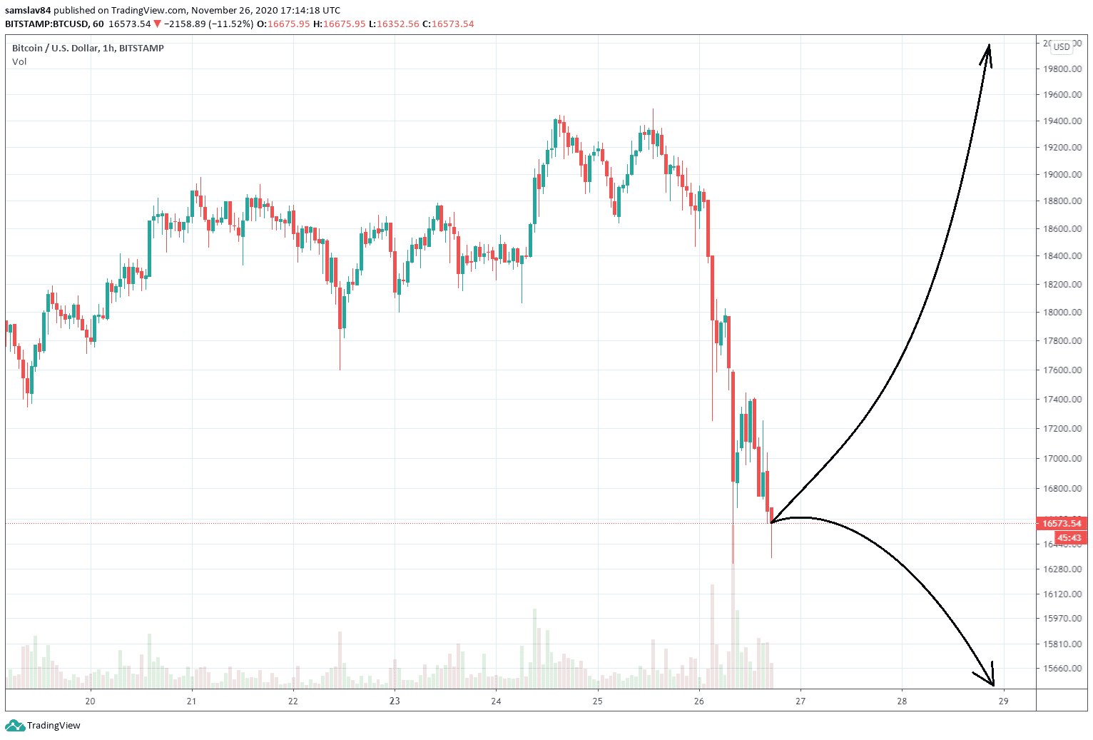 Včera sa už dostal naozaj blízko. Na hladine 19 480 $ vytvoril trojročné high. Bohužiaľ, vyššie sa nedostal. Všetkých totiž prekvapila korekcia, ktorá cenu Bitcoinu osekala o 3000$. Aktuálne sa obchoduje za 16 700 $.