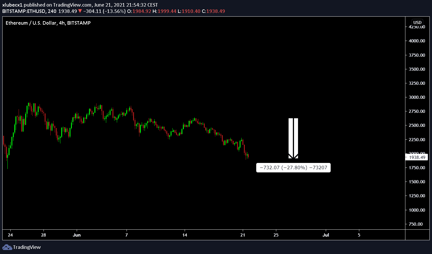 Ethereum dokonca za rovnaký čas stratilo až 28 % a blíži sa ku kľúčovému supportu na 1 800 USD.