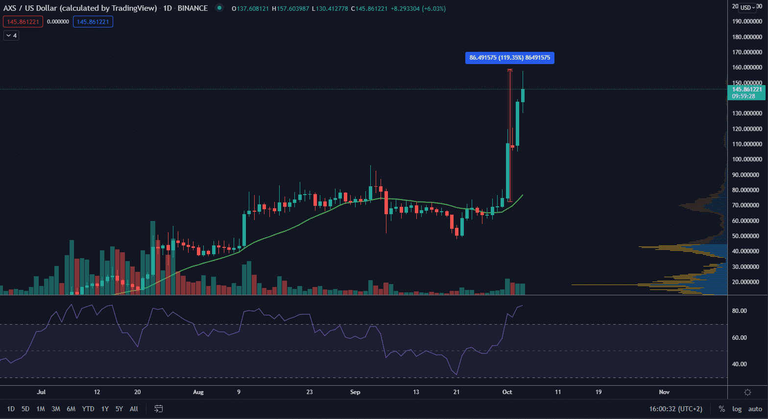 Po korekciách vedených RSI slúžila 21-dňová EMA obchodníkom ako indikátor nákupu. Podrobne sa obchodníci rozhodli kúpiť pokles v očakávaní, že cena AXS sa znova otestuje a uzavrie nad svojimi predchádzajúcimi vysokými úrovňami.