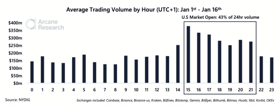 USA dominujú v obchodovaní s BTC podľa správy zverejnenej spoločnosťou Arcane Research. 90-dňová korelácia bitcoinov s indexom S&P 500 je momentálne najvyššia od októbra 2020. Medzitým obchodné hodiny v Spojených štátoch vykazujú najväčšiu aktivitu.