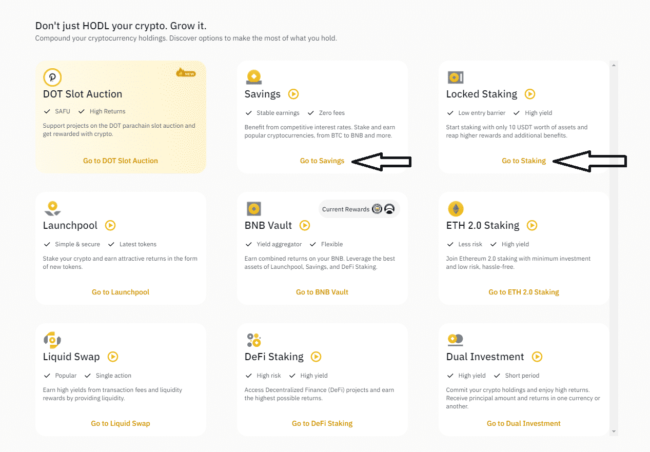 Binance staking sa rozdeľuje na niekoľko častí, povieme si o nich v ďalšej časti tohto návodu. Vo väčšine prípadov je výnos garantovaný, a to napríklad s odmenou 50 %. Je potrebné do tohto produktu urobiť vklad na istú dobu a následne sa mi kryptomeny budú postupne zhodnocovať. Niektoré služby fungujú na princípe uzamknutia na určitú dobu. Iné zasa nemajú fixne stanovené množstvo mesiacov, počas ktorých musím mať kryptomeny v tejto službe. Samozrejme, kedykoľvek si môžem kryptomeny vybrať, akurát napríklad pri niektorých produktoch, ak si vyberiem kryptomeny skôr, tak nárok na odmenu zaniká.