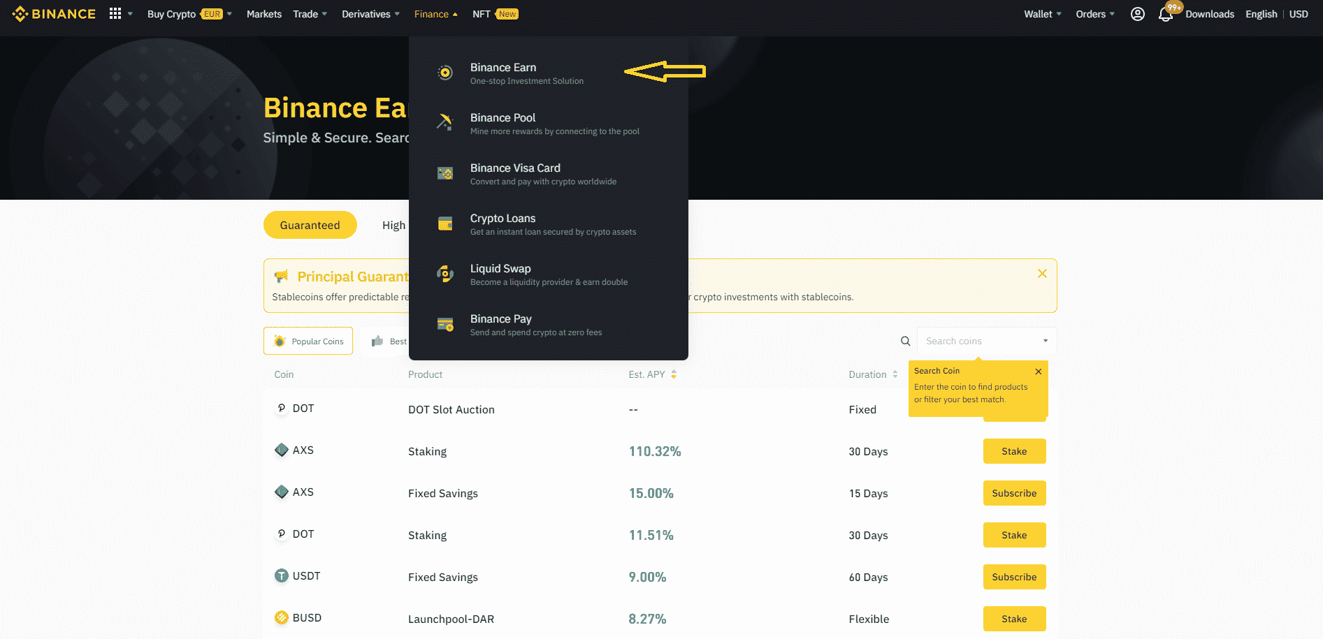 V prvom rade si treba vytvoriť účet na tejto burze. Môžeš použiť náš affiliate link a získaš 5 % doživotnú zľavu na poplatkoch a ešte k tomu bonus 600 USD za splnenie rôznych úloh. Odporúčame využiť túto ponuku. Ďalej treba prejsť procesom verifikácie účtu, zabezpečenia a KYC overenia. Toto všetko, ak nevieš ako urobiť, sa môžeš dočítať v tomto návode. Keď máš účet pripravený na produkt staking, je potrebné hore v menu nájsť kategóriu Finance > Binance earn.
