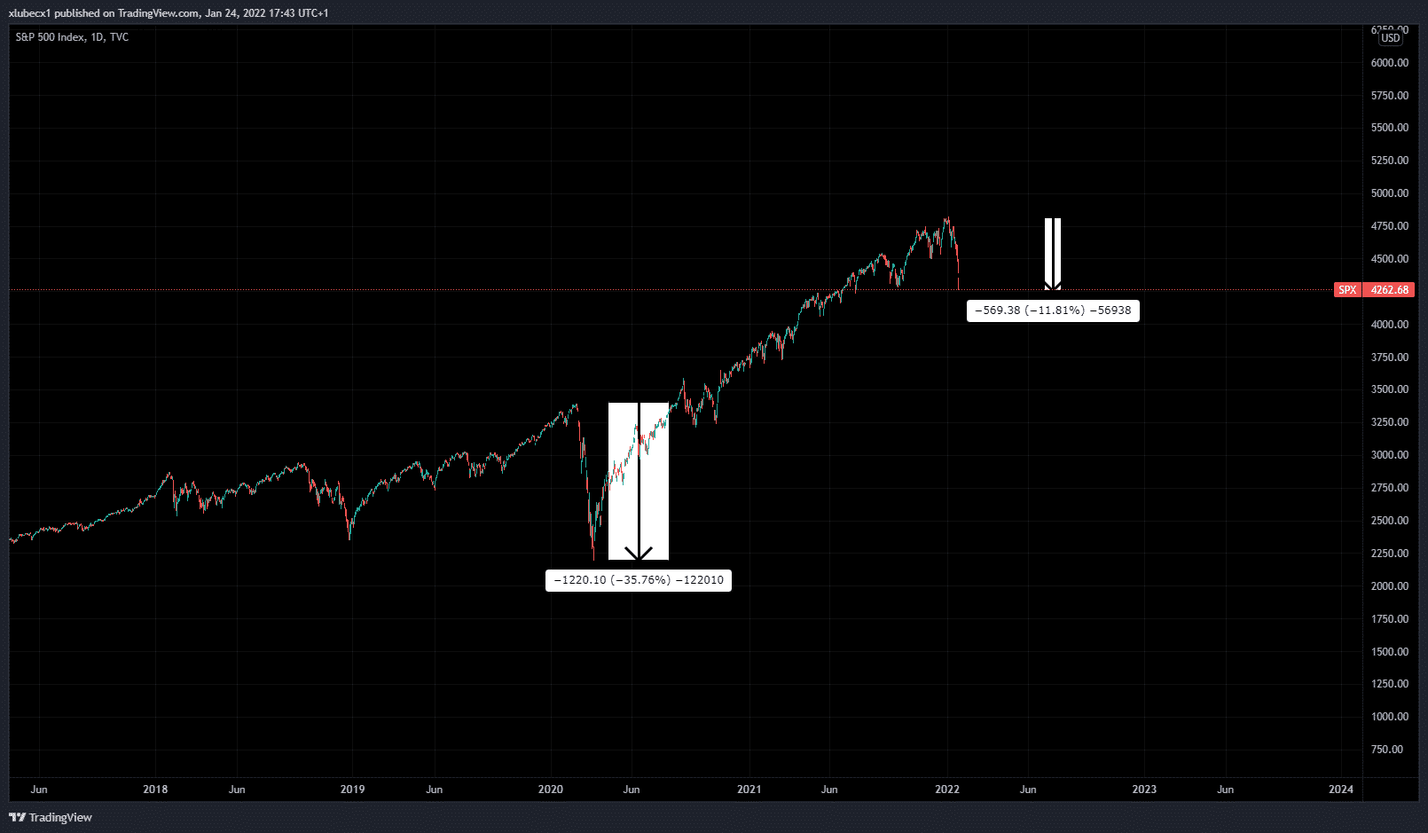 Najväčší americky index naposledy zaznamenal podobný pokles ešte počas koronakrízy, keď spadol takmer o 40 %. V súčasnosti je pokles oveľa miernejší, no to neznamená, že sa už úplne skončil. Práveže naopak, môžeme byť iba na začiatku ďalšej krízy menšieho, alebo celosvetového charakteru. Zatiaľ je cena pohybu -12 % od posledného vrcholu.